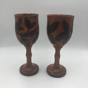 Vintage Hand Carved Wood Goblets Floral Design Collectible Set of 2. Goblets are vintage pre-owned. Please see all photos for visible condition. No original box. These were not used - they were for decorative purposes on display. Each cup is unique due to the hand carving - the one is slight smaller than the other. Approximately 7 inches tall x 2.5 inches wide. Very nice stemware collectible! Actual age/brand unknown.
