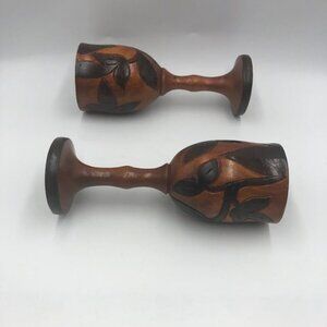 Vintage Hand Carved Wood Goblets Floral Design Collectible Set of 2