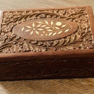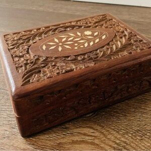 Vintage Hand Carved Wooden And Inlaid Trinket Box From India