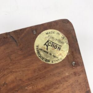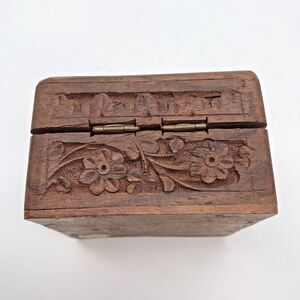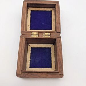 Vintage Action Hand Carved Wooden Box. Inlayed Flowers & Leaves. Made In India. Brown Hinged 4 x 4 x 2.5 inch Square Box. Blue Velvet lining. Someone with time could oil this cute box up and make it look new again.