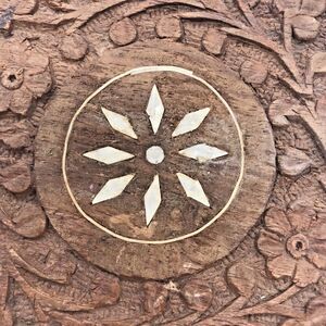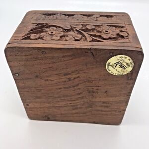 Vintage Hand Carved Wooden Box Inlay Flower Leaves Made In India Hinged Square