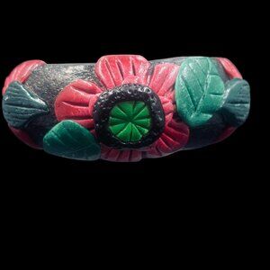 Vintage, Hand Carved, Wooden, Bangle, Bracelet, Floral, Flower, Leaf, Painted, Chunky, Statement, Retro, Boho, Folk Art, Colorfu