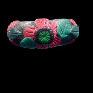 Vintage Hand Carved Wooden Floral Flower Leaf Bangle Bracelet Red Green Boho