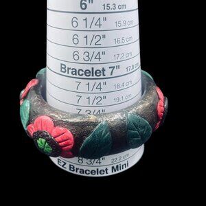 Beautifully hand-carved wooden bangle bracelet featuring bold red flowers and deep green leaves against a rich dark wood base. The intricate floral relief design wraps fully around the bracelet, adding texture and dimension. The interior is smooth with a subtle reddish finish, ensuring comfort while worn. Measures approximately 7.75, making it a versatile fit for most wrists. This chunky statement piece blends natural craftsmanship with vibrant retro charm.