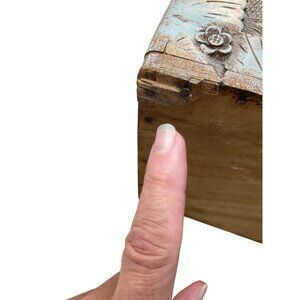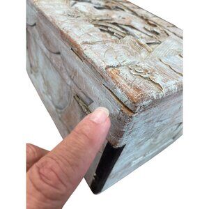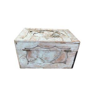 A rustic wooden storage box showcasing intricate hand-carved details that evoke medieval folk art traditions. The piece features a weathered blue-white patina with intricate relief carving depicting nature-inspired scenes and floral motifs. Crafted from solid wood with brass hinges, this vintage box offers both decorative charm and functional storage. In overall good condition with normal wear pointed in pics anmd mnop opther defects noted. SKU 9324