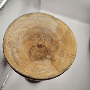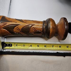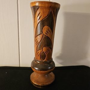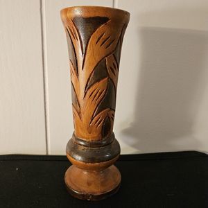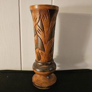 This vintage wooden vase is a stunning addition to any collection. The item features beautiful carvings and a unique two-tone brown finish that complements its Bohemian and mid-century modern design. Measuring 8 inches in height and 3 inches in length, this hand-carved vase is perfect for all occasions and can be used as a decorative piece or as a functional vase for flowers. The item is original and has a natural finish, adding to its charm and character. Additionally, the vase is handmade and has a weight of 11.5 ozs.