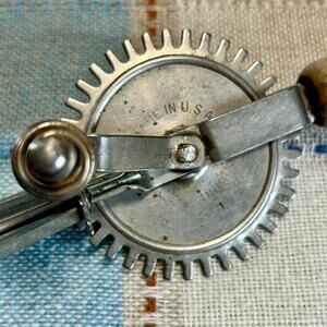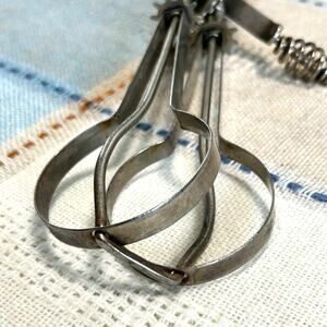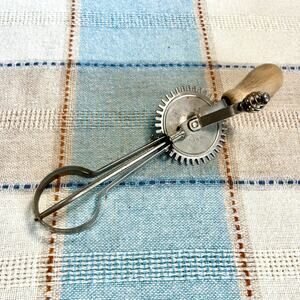 Classic vintage hand-crank egg beater made in the USA, featuring sturdy metal gears and a turned wood handle. This manual egg beater is both decorative and functional, perfect for vintage kitchen displays, farmhouse décor, or light-duty mixing. The gears turn smoothly, and the piece shows lovely patina consistent with age and use.