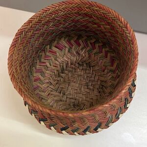 This vintage Indian basket is a beautiful piece of art that showcases expert craftsmanship and attention to detail. Made from pine needles, it features a three-tone pattern and intricate weaving, making it a unique addition to any collection.