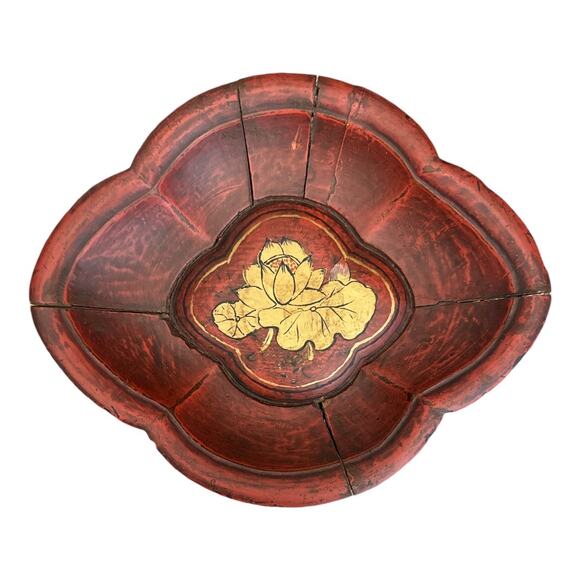 Vintage Hand Created Chinese Carved Wooden Red Gold Bowl