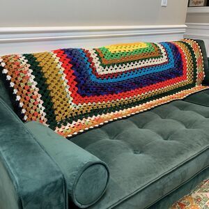 This vintage hand-crocheted Afghan is a unique piece of home decor with a rainbow-colored square within squares design. Measuring 64" x 57", this boho style sofa throw is made in the United States and features bright multicolor crochet material. Ideal for adults, this handmade Afghan adds a colorful and retro touch to any room in your home. Easy to care for with machine wash cold gentle instructions, this Afghan is a cozy and vibrant addition to your living space.