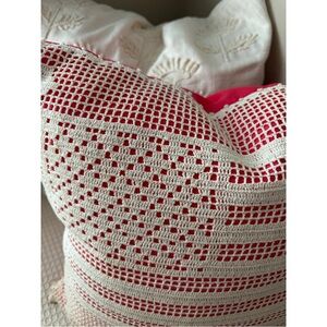 Hand stitched onto red pillow, back of pillow has some light fading as shown.