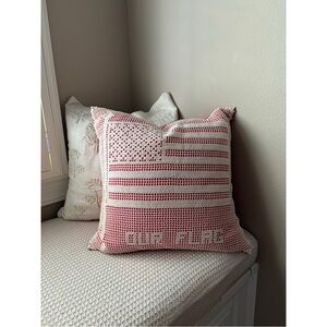 Crochet is cream, “OUR FLAG” with American flag design. Stitching in amazing condition! Classic Americana. Perfect for next 4th of July.