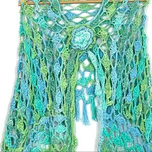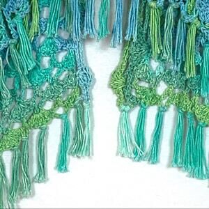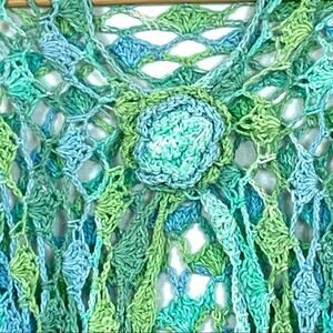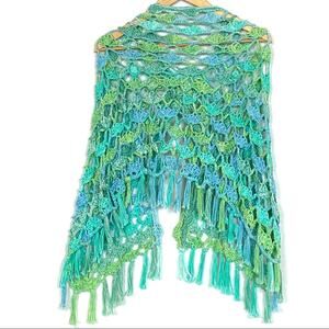 Vintage Hand Crocheted Variegated Poncho One size. Features blue and green Ombré yarn, hand crochet, shorter in back, rosette at bust, fringe, pullover head,