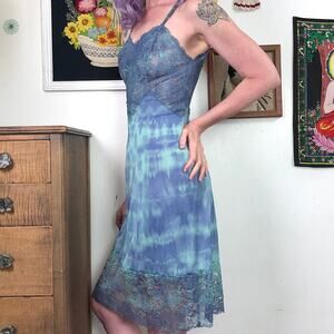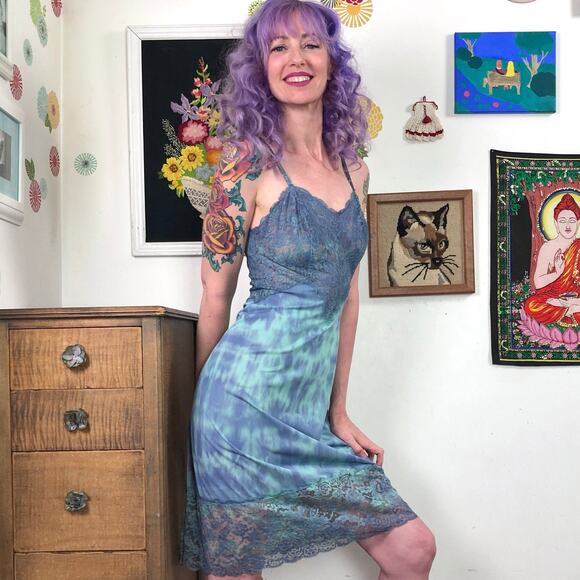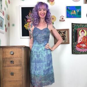 Gorgeous vintage Vanity Fair slip that has been hand dyed a stunning green and blue tie dye that reminds me of a moody galaxy! This slip is made of nylon and has a sheer lace hem and bust.