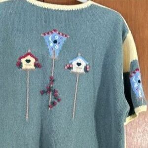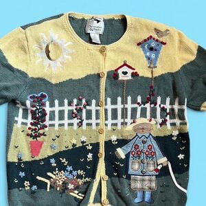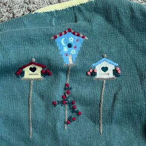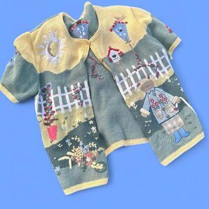 Vintage Hand Embroidered Sunny Floral Garden Cat Cardigan W/ birdhouses in multi-coloured hues. Size small. Adorable floral buttons. Beautiful condition.
