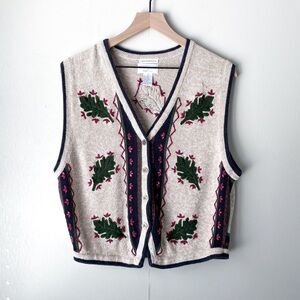 Vintage Hand Embroidered Leaf Fall Print Ramie Cotton Knit Cottage Core Sweater Vest XL