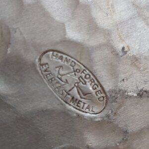 Vintage Hand Forged Everlast Metal Serving Tray w/Handle with an Embossed with Pine Cone Design. Made of hammered aluminum hard metal. Good condition. Measures approximately, 6” tall and about 9.5” diameter