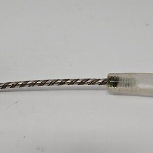 Up for offer here is a very fine studio hand crafted, vintage 3rd quarter 20th century, kitchen utensil soup or sauce serving ladle, that is made with hand hammered pewter, rope twist pewter and brass, copper or bronze handle and lucite handle end. Excellent condition, lucite handle does show wear from use. The lucite handle is attached by a long threaded screw and cane be replaced. Unsigned. Measures approximately 12" long, the round form serving bowl end measures about 3" wide x 1.5" deep. I also have the matching potato masher and slotted spoon in separate listings.