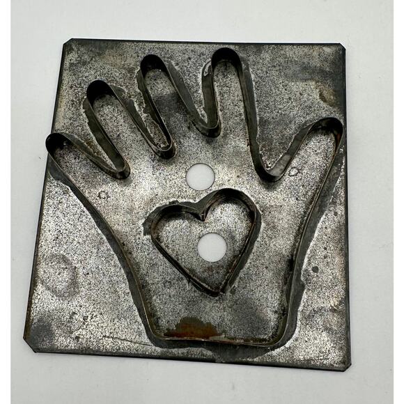 Add rustic charm to your kitchen or craft room with this vintage metal cookie cutter mold featuring a hand with a heart in the center. Handmade from welded steel with a well-worn, primitive finish. Perfect for farmhouse décor, crafting, clay, dough, or display. A unique artisan piece with lots of character.