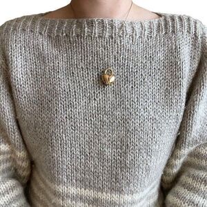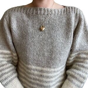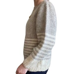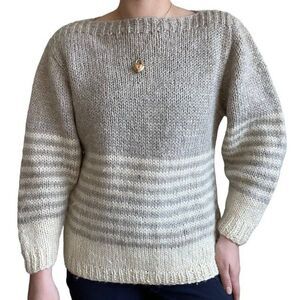 Vintage Hand Knit 100% Wool Brown White Striped Winter Boat Neck Sweater Sz M