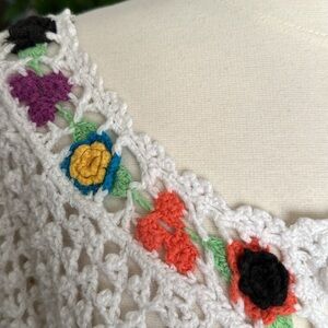 Whimsical, cottagecore, crochet, feminine, sweet, floral, loose knit, hand knit, Y2K describe this fun cardigan constructed in 55% ramie 46% cotton. She has a cropped length, loose crochet knit, and trimmed with multi colored crocheted flowers.