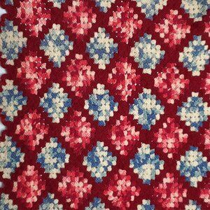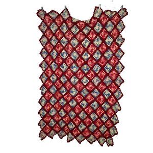 Vintage Hand Knit Afghan Lap Blanket Red Blue Pink Diamond Edge Granny Square