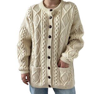 Vintage Hand Knit Blarney Woolen Mills White 100% Wool Irish Fisherman Cardigan