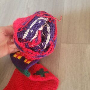 This vintage knit Christmas stocking features a charming Santa Claus and tree design. Crafted with vibrant colors, it's an inviting addition to holiday decor.
