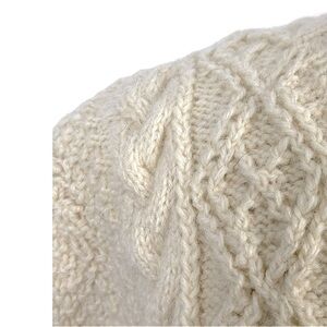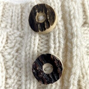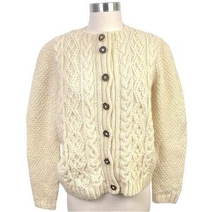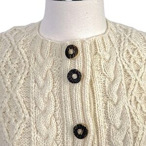 Vintage Hand Knit Cream Wool Fisherman’s Cardigan Sweater W/Hand Carved Buttons. Estimated size M/L. Excellent hand knit vintage condition. Comes with a little bag of extra yarn and a spare button. Buttons appear to be carved from a natural material such as bone or some time of wood and are all a little unique. Beautiful hand knit and in pristine condition. No tags due to being handmade, size is estimated based off of measurements. Please see all photos for details and measurements below to ensure proper fit.