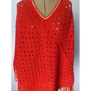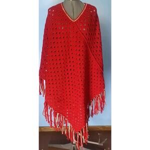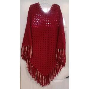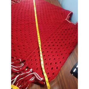 This Unique vintage hand knit crochet boho fringe hippie Granny Poncho cape is approximately 46 inches at its widest point, and it is 40 inches long then add 7 more inches to include fringe. Boho Hippies This poncho is in great pre-owned shape. Perfect for football games or just styling. Red and white. Look at all pictures for complete condition. Any questions Please ask prior to purchasing. Thanks for looking