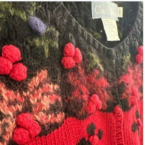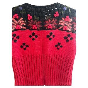 Vintage Hand Knit Embroidered Floral Cranberry Red Ribbed Waist Sweater Size S