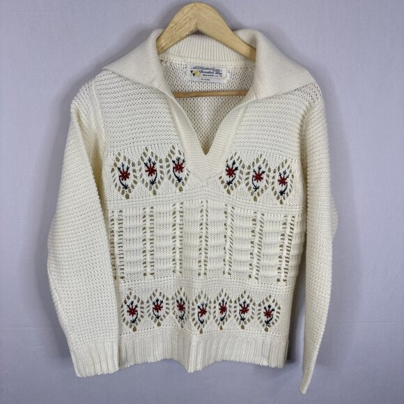 Vintage cream knit sweater featuring a traditional Nordic-style floral motif with embroidered red and green flowers. Chunky open-knit construction with a wide shawl-style collar and textured panels throughout. Cozy cottagecore / alpine aesthetic. Labeled size Large but fits significantly smaller—please see measurements below for accurate fit.
