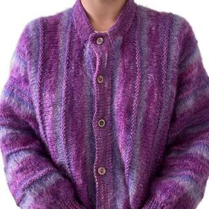 Vintage Hand Knit Purple Wool Mohair Fluffy Oversized Striped Cardigan Sz L