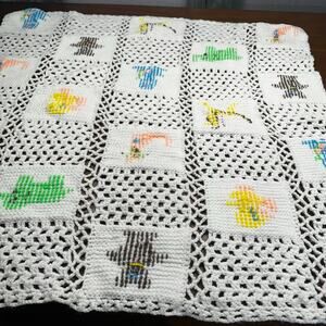 Vintage Hand Knit Quilt Crochet Afghan 36” x 36” Baby Blanket Animals Nursery