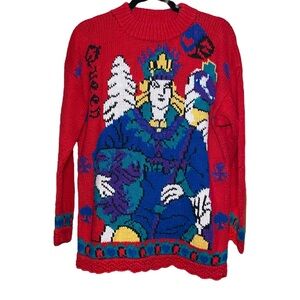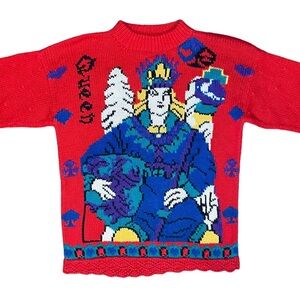 Vintage Hand Knit Sweater Queen Of Hearts Size Large XL Red Long Sleeve