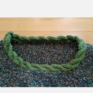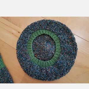 Sage green and multi color complementary yarn, two tone pullover with matching french cap, and leggings.