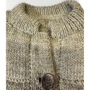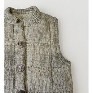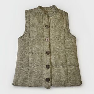Classic hand-knit wool vest featuring a cozy grid stitch pattern and bold crest-style buttons. Neutral taupe tone makes it perfect for layering over shirts or dresses. Timeless vintage style with a rustic, handmade charm.