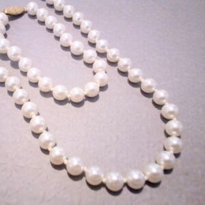 The set features gold-tone fish hook clasps, ensuring both beauty and security. The necklace measures a graceful 18 inches in length, while the bracelet adds a touch of refinement at 7 1/2 inches. Each pearl boasts a width of 8mm, adding a subtle yet striking presence to any ensemble.
