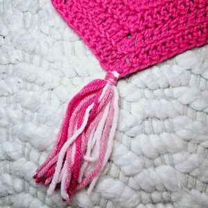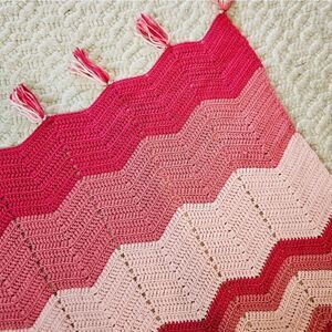 Vintage Hand Made Crochet Pink Tone Zig Zag Chevron Tassel Afghan Blanket Throw