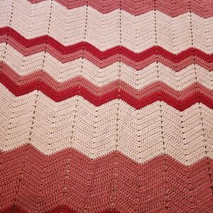 This is a gorgeous hand crochet chevron stitch afghan throw. Beautiful hues of different colors of pink, corals, and cream with tassels on both ends. A retro mid century home accent for a cottage core or granny core vibe. Display on the back of your sofa, chair or end of bed. Warm cozy personal size blanket to lay across your lap while relaxing on the couch.