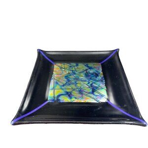 Vintage Hand Made Dichroic Art Glass Square Dish Plate Multicolor Iridescent VTG