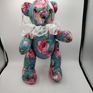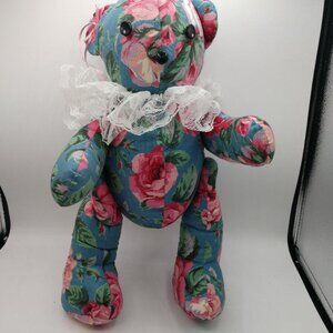 Vintage stuffed quilt bear, hand made bear with rose floral material with lace around neck