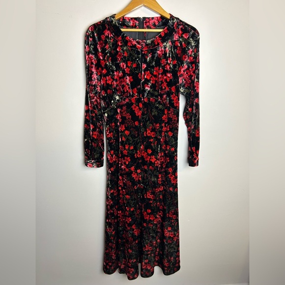 Elegant floral velvet dress with a stunning red and black design. Perfect for any occasion.