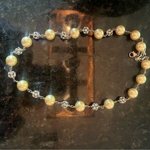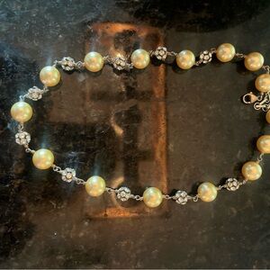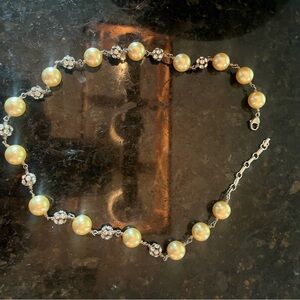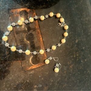 This exquisite hand made jewelry set features lustrous gold pearls paired with elegant crystal silver accents. Perfect for adding a touch of sophistication to any outfit. Necklace and Earrings