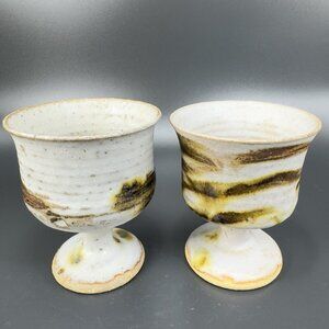Vintage Hand Made Stoneware Pottery Footed Cups Goblets Set 4 Drip Glaze Cups
