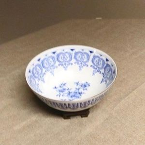 This is a large, vintage, hand painted ceramic bowl in white with blue. Inside the bowl is a blue design of leaves and pomegranates.