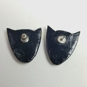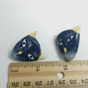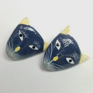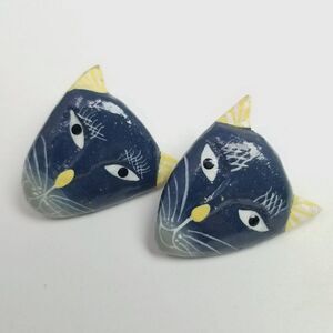 Vintage Hand Painted Blue Yellow Cat Face Stud Earrings, Wooden, Retro Folk Art