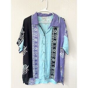 Vintage Hand Painted Boxy Button Shirt Womens Large Batik Print Rayon Bali 90s