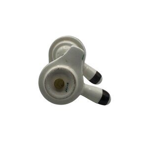 These vintage ceramic salt and pepper shakers feature a delicate hand-painted vine design. The white ceramic body is accented with green leaves and burgundy vines, complemented by black tips on the spouts.