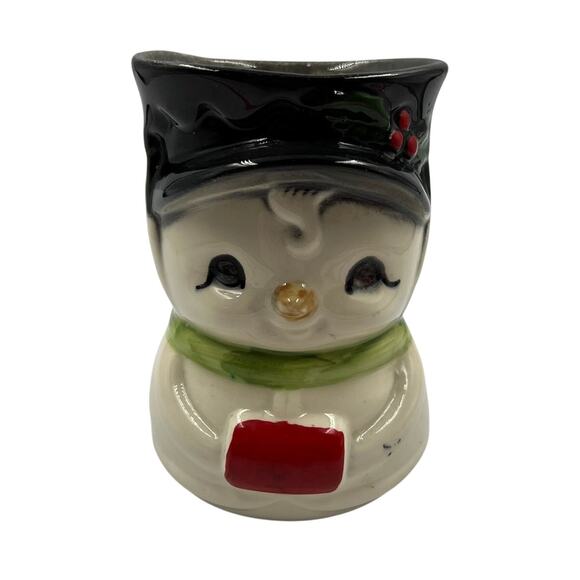 Vintage Hand Painted Ceramic Snowman Container Vase Jar Kitsch Cute Winter